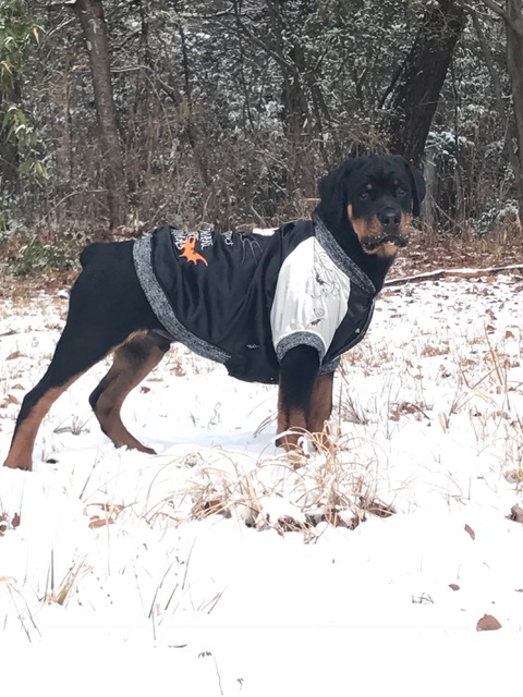 皆さま、遅くなってしまいましたが(^-^; 明けましておめでとうございます!! 今年も宜しくお願い致します(^O^)/     昨日は雪が積もりました!といっても大した積雪では無かったです(笑)    少しだけ時間が空いたのでロットワイラーのパピー軍団を連れて近くの空き地で遊ばせたかったんだけど、私一人では4頭のパピーを連れて歩いて行くのは鵜飼い状態になってしまうので…(*_*;(笑)  今回はダークくんだけ連れて行きました!