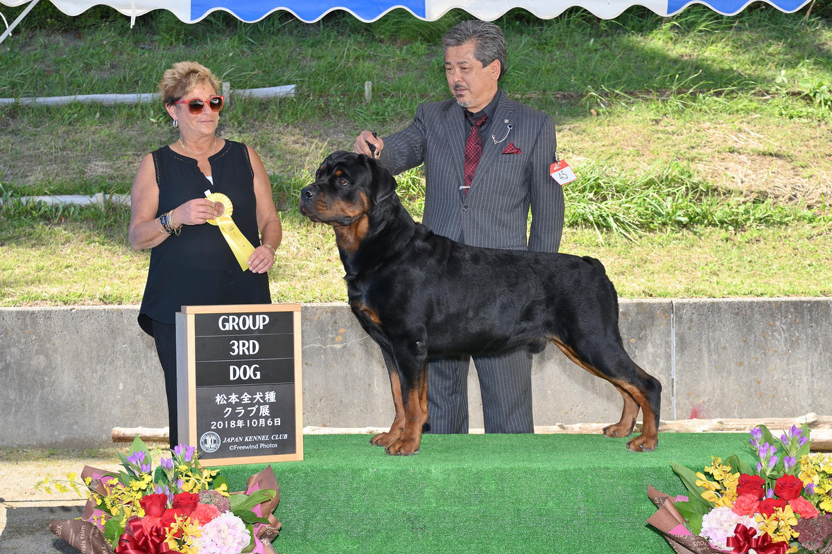 6日㈯ 松本全犬種クラブ展  エントリーはジュニアクラス♂ビースト・シャドウ(オーナーMさん)・アダルトクラス♂ダーク ヤングアダルト♀蘭子・チャンピオンクラス♀ホタル(オーナーYくん)・ガーナ(オーナーTさん)です!  久々にアダルトクラスで他所の犬舎のメスが2頭エントリーされていて、楽しみにしてたんだけど、2頭共棄権...  話によると、肥らせ過ぎて出せない!!って。  私たちは何日も前からベストコンディションで出せるように準備して行くんですけど。   それを聞いた時は情けない。。。って正直思いました。      気を取り直して、蘭子はチャンピオン2頭と対戦! 見事オーバースペシャル!!BOB獲得(^^V  オスはビーストとシャドウの兄弟対決! ビーストご機嫌斜めだったのか触診されるのを嫌がり、シャドウはルンルンで走ってました♬ やっと身体が充実してきたダーク、BOB獲得!! グループ戦、蘭子は入賞しませんでしたが、ダーク頑張りました!